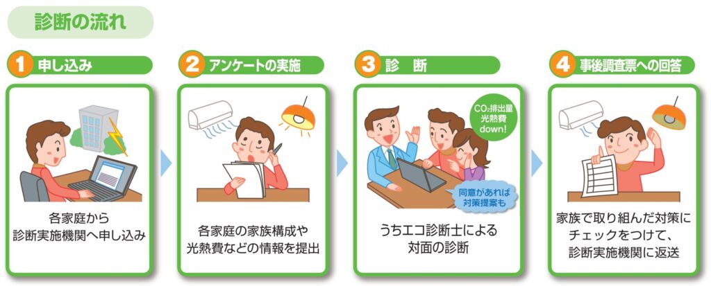 「うちエコ診断」では、提案を押しつけるものではなく、家庭における省エネの取組みの「選べるヒント」として提示します。また、受診される方のご希望があれば、診断後の省エネ実施支援や、太陽光発電設備等の創エネ導入支援など、受診後のフォローとして、推進窓口において引き続きサポートします。