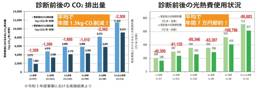 「うちエコ診断」を受診後、提案された対策を実施した家庭では、年間の光熱費が平均で 約7万円お得になっています。「うちエコ診断」の受診は、単に“環境のため”ではなく、“暮らしのため”の取組みでもあるといえます。