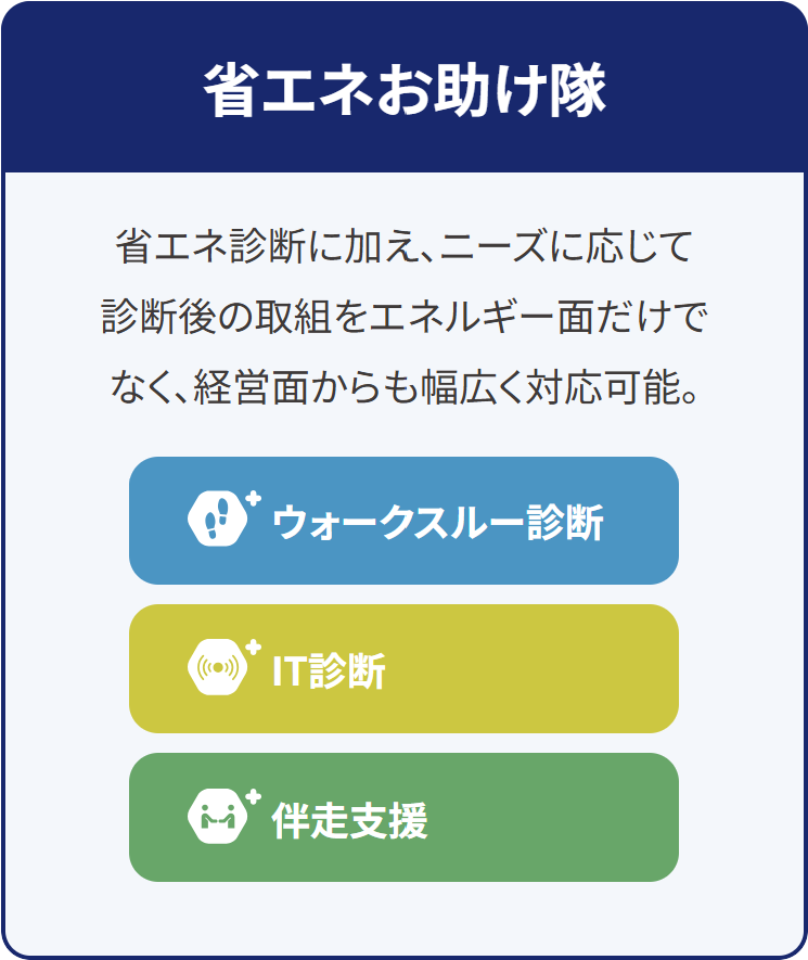 「省エネお助け隊」は、地域に拠点を置き、中小企業等への省エネ診断による計画立案、省エネ補助金の情報提供を行うほか、ニーズに応じて、省エネの取組みを一緒に進めていくためのサポート(伴走支援)を実施します。